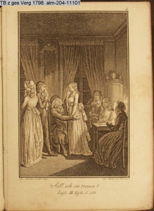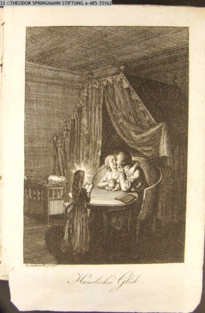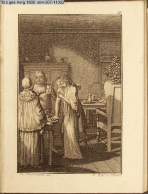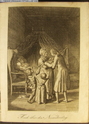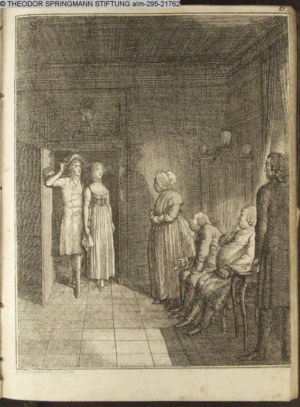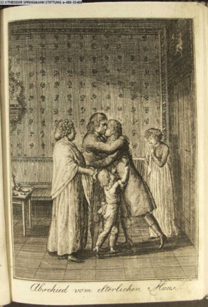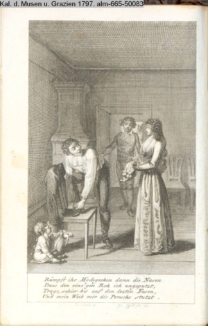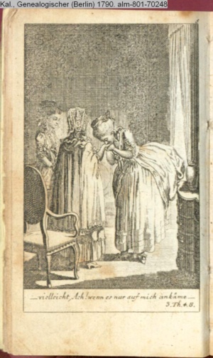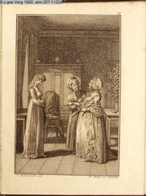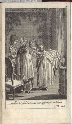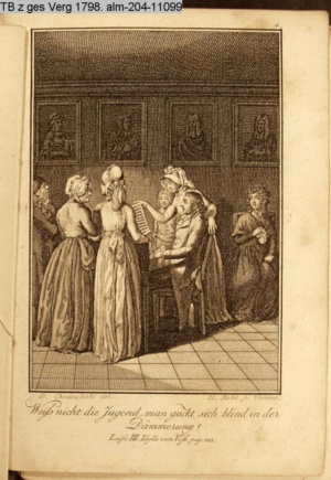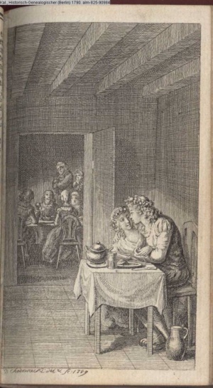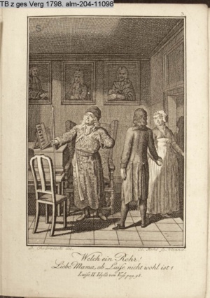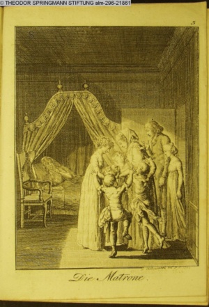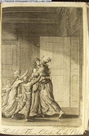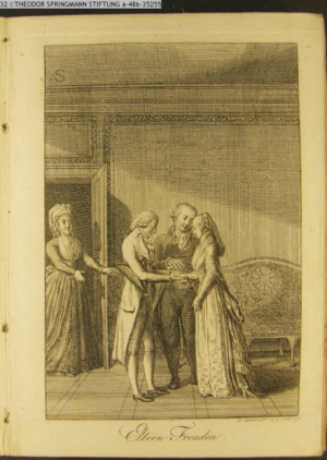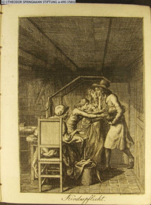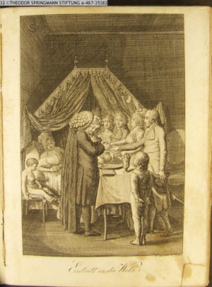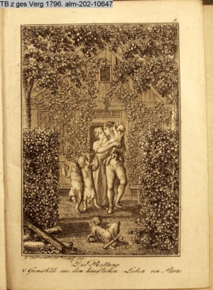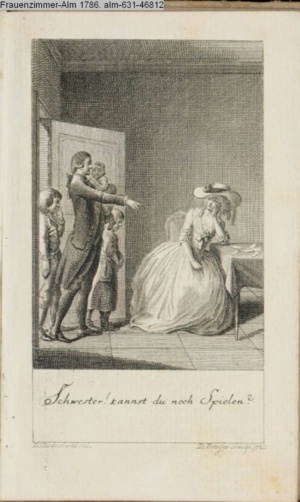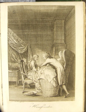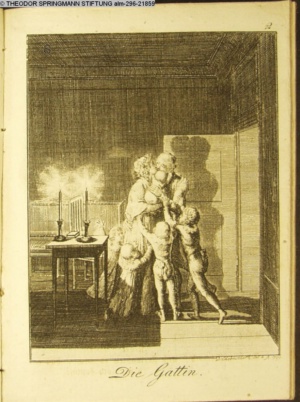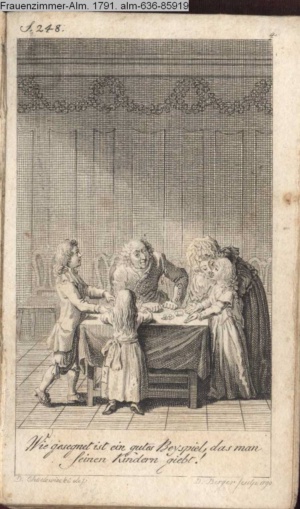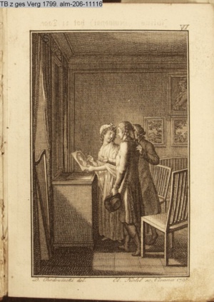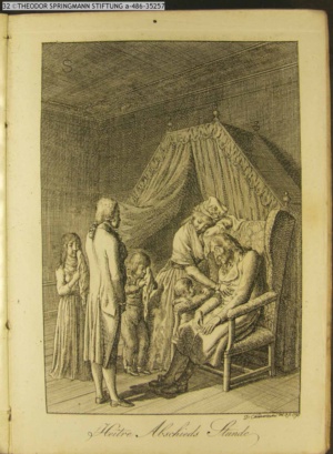 3. Blatt der Suite »4 Blätter zu der Familie Hellmuth von Hiemer« von D. Chodowiecki 1798. s. BAUER, Jens-Heiner: Daniel Nikolaus Chodowiecki. Das druckgraphische Werk. Die Sammlung Wilhelm Burggraf zu Dohna-Schlobitten. Ein Bildband mit 2340 Abbildungen in Ergänzung zum Werkverzeichnis von Wilhelm Engelmann. Hannover 1982. No. 1934-1937