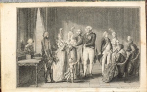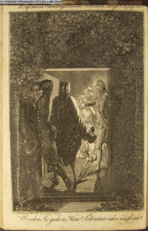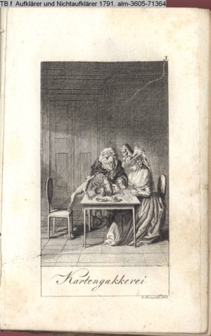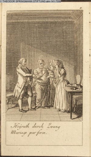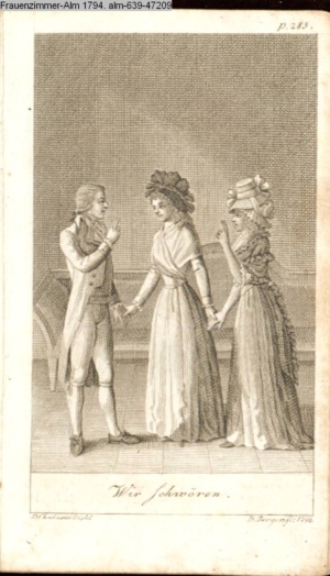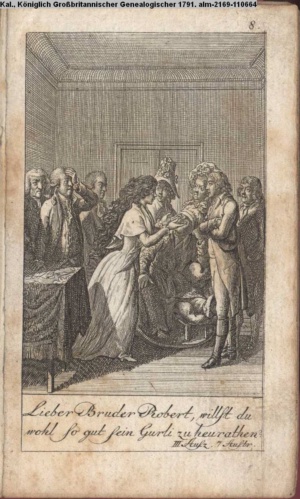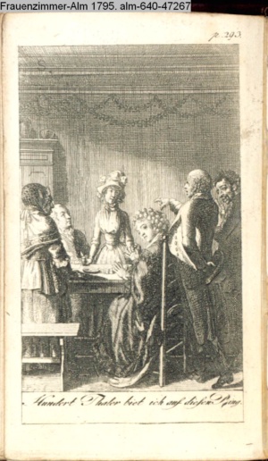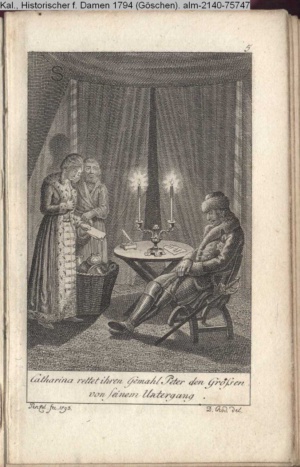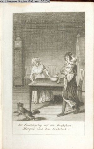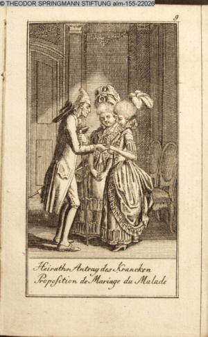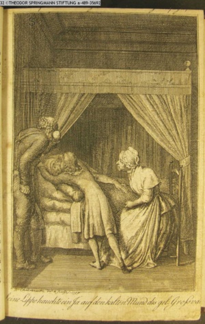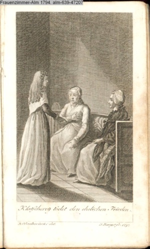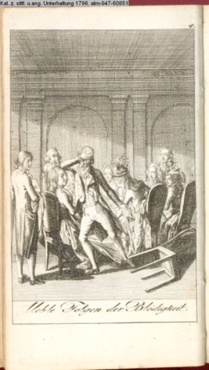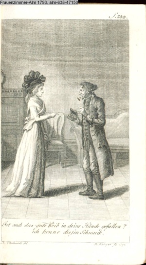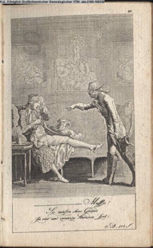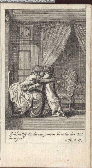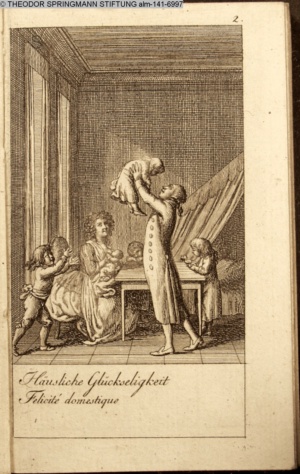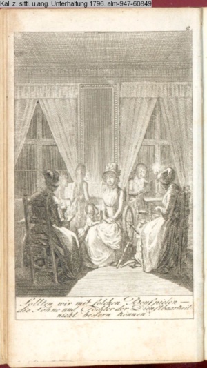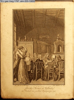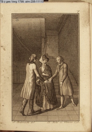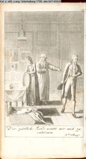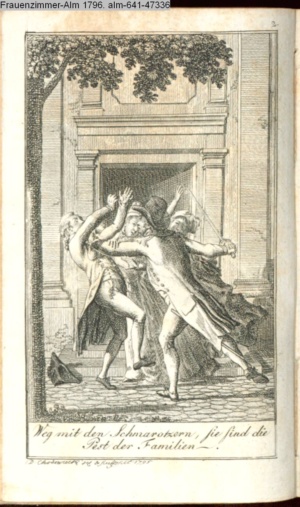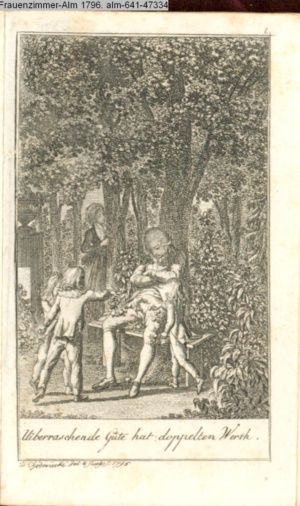 3. Blatt der Suite »4 Blätter zu der Familie Hellmuth von Hiemer« von D. Chodowiecki 1798. s. BAUER, Jens-Heiner: Daniel Nikolaus Chodowiecki. Das druckgraphische Werk. Die Sammlung Wilhelm Burggraf zu Dohna-Schlobitten. Ein Bildband mit 2340 Abbildungen in Ergänzung zum Werkverzeichnis von Wilhelm Engelmann. Hannover 1982. No. 1934-1937
