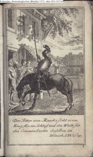 Der Ritter von Mancha sieht einen / Krug für ein Schloss und den Wirth für / den Commendanten desselben an / D. Quich. I. Th. 2. Cap.