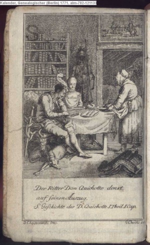 Der Ritter Don Quichotte denkt / auf seinen Auszug. / S. Geschichte des D. Quichotte I. Theil. 1. Cap.