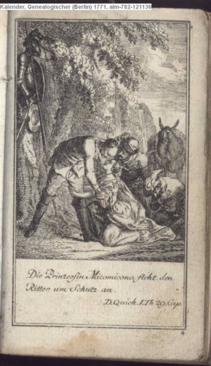 Die Prinzessin Micomicona fleht den / Ritter um Schutz an. / D. Quich. I. Th. 29. Cap.