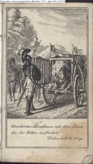 Unerhörtes Abentheuer mit den Löwen / den der Ritter ausfordert. / D. Quich. II. Th. 17. Cap.