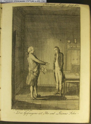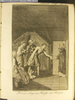 Graphik im Kalendarium; an der Graphik: Hermann Lange pag. 450. IIllustration zu »Herrmann Lange« von A. Lafontaine