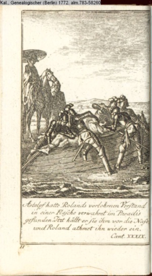 Astolpf hatte Rolands verlohrnen Verstand / in einer Flasche verwahret im Paradis / gefunden. Itzt hällt er sie ihm vor die Nase / und Roland athmet ihn wieder ein. / Cant. XXXIX.