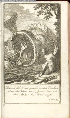 Roland fährt mit Gewalt in den Rachen / eines Seethieres und sperrt ihm mit / dem Anker das Maul auf. / Cant XI.