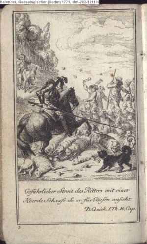 Gefählicher Streit des Ritters mit einer / Heerde Schaafe die er für Riesen ansieht. / D. Quich. I. Th. 18. Cap.