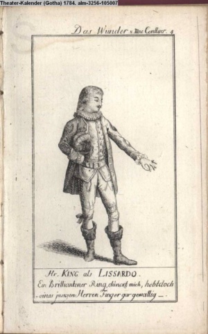 Das Wunder v. Mne. Centtiver: / Hr. King als Lissardo. / Ein Brilliantener Ring, dünckt mich, hebt doch / eines jungen Herrn Finger gar gewaltig