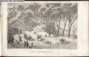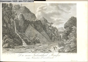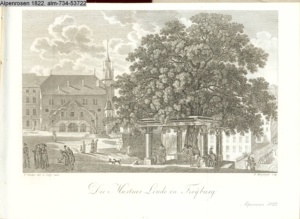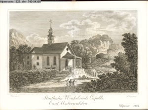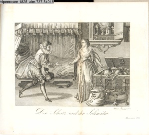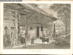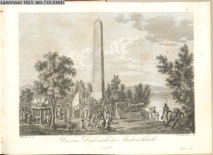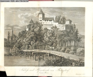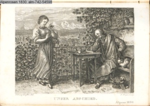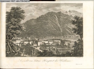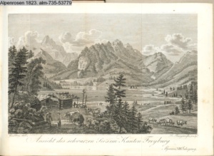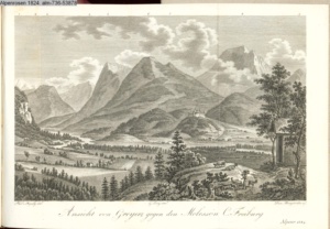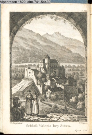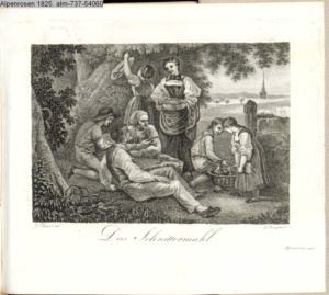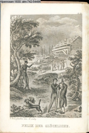 Anmerkung am bez. Text : Die hier beygefügte Ansicht, von der Hand einer geschätzten Künstlerinn gezeichnet, macht das Gegenstück zu der Ansicht im Jahrgange 1824, Seite 341 der Alprosen. Dort ist die Ferne südöstlich, hier südwestlich genommen [...] s. Graphik »Neuenstadt am Bieler-See im Canton Bern« in: Alpenrosen 1824; INr 53925