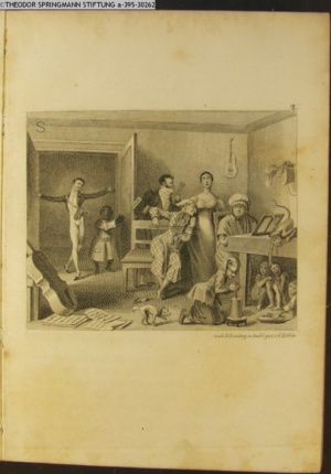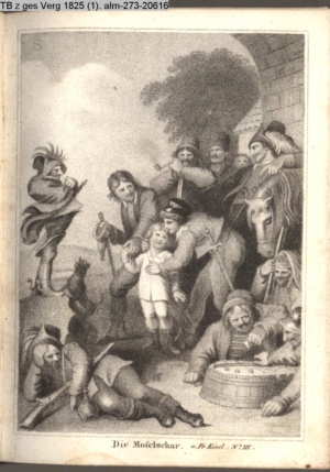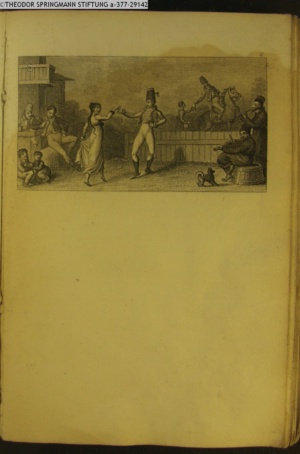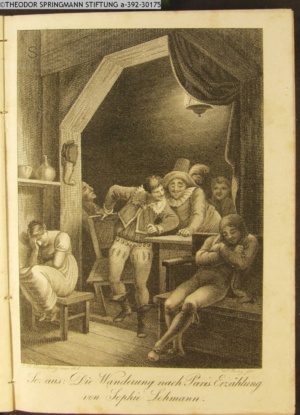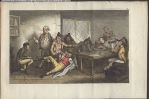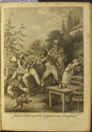 Nummerierung IV.; auszufaltende kol. Illustration zu »Abentheuerliche Wanderung von Weimar nach Carlsbad« von St. Schütze