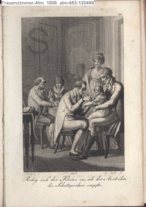 Ruhig sah der Kleine zu, als der Arzt ihm / die Schutzpocken impfte